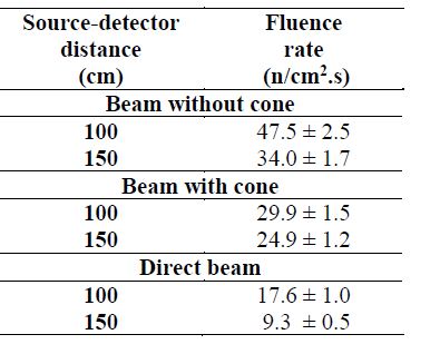 The standard ISO 8529-2 [11] recommends that the influence of scattered radiation should not exceed 40% at the calibration point. This means that the ratio of the total fluence rate (without cone) to the scattered fluence rate (with cone) should not exceed the value recommended by the standard. The scattering fraction values at distances of 100 cm and 150 were 63% and were 88% respectively. Table 2 shows the neutron fluence rates as a function of distance for LCN and LNMRI laboratories.