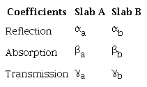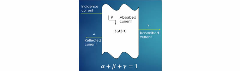According with Fig. 3, a current of is incident on slab A, a current rate is reflected (αa), the other is absorbed (βa) and the last one is transmitted to slab B (γa). This last current begins its incidence on slab B and goes through the same processes as slab A, a rate is reflected, other absorbed and the last rate transmitted. However, part of this reflection that reach the slab B, returns to slab A, where what is called "Ping Pong" of reflections between the slabs start to happen, as can be seen in the figure. Finally, each of these reflections that occur in this Ping Pong will generate contributions to the total reflection, absorption and transmission of the slabs. Therefore, a sum of all these contributions must be made to obtain the final values. It is worth remembering that this contribution event happens instantly. Now, it can be defined the reflection, absorption in each slab and transmission through the slab B according to the equations below: