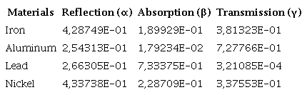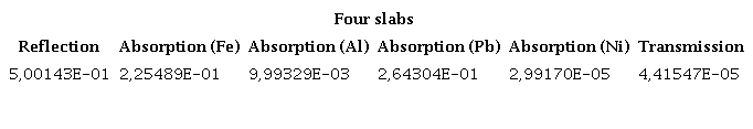 The Tab. 3 shows the data obtained by albedo's method algorithm for the shielding of 4-slabs composed by Iron, Aluminum, Lead and Nickel respectively.