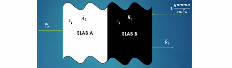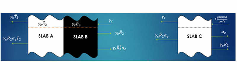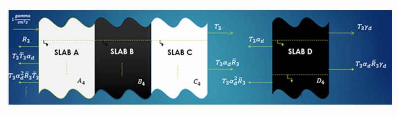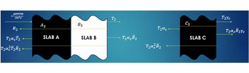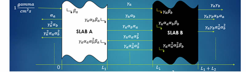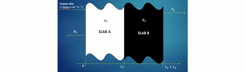 In a bilaminate shielding model, where there are two slabs, it is possible to develop a mathematical method whose objective is to determinate the total reflected, absorbed and transmitted by the two slabs, applying the Albedo's Method, following the incident radiation path that can be schematized as follows bellow (Fig. 2):