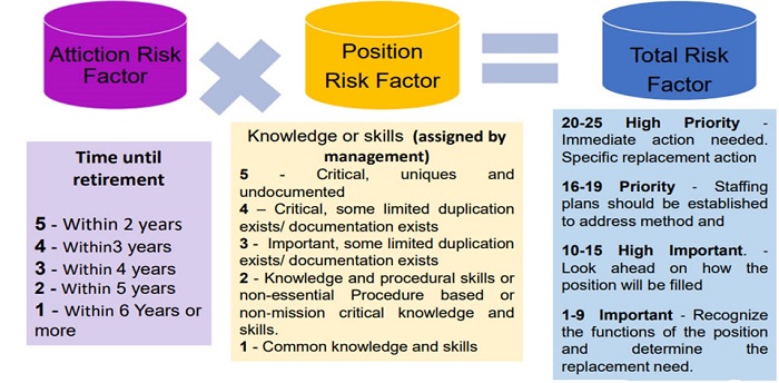 The Dropout Risk Factor is based on the employee's projected retirement time, as described in Figure 3 [16]. The Position Risk Factor depends on the manager's analysis, that takes into account the employee's unique knowledge and skills, in addition to estimating the degree of difficulty or level of effort required to replace the position, as shown in Figure 5 [16]. Thus, multiplying the Dropout Risk Factors by the Position Risk, one arrives at the Total Risk Factor and its meanings (Figure 3).