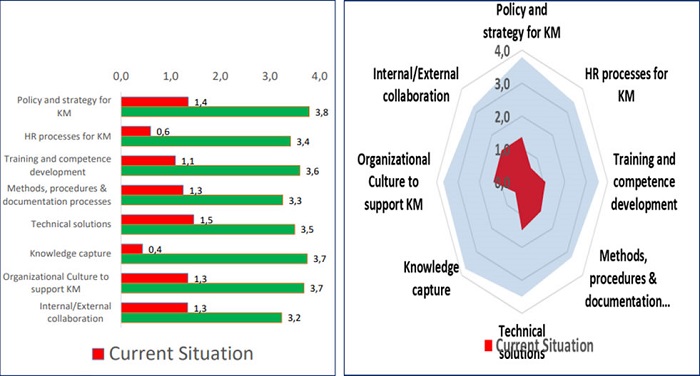 To assess the level of maturity of KM at IRD, a tool developed by the IAEA was applied [17]. This tool can be found at IAEA TECDOC SERIES 1880. The self-assessment methodology is a tool to help identify strengths and development areas in the organization's overall KM strategy and it has 8 (eight) categories as described below: