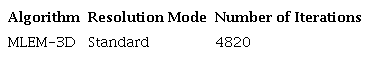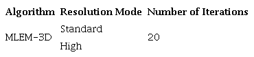 The image acquisition file was reconstructed with two different protocols where the reconstruction algorithm MLEM-3D and the iteration number (20 iterations) were fixed, and the resolution mode were varied between standard resolution (SR) and high resolution (HR). For SR and HR modes the voxel sizes are 0.50 x 0.50 x 0.50 mm and 0.25 x 0.25 x 0.50 mm respectively. The software LabPET 1.12.1 provided by the scanner manufacturer was used for image reconstructions. Table 3 summarizes the protocols used in this study.