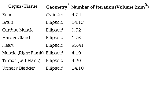 No attenuation or scatter corrections and no post-filtering are applied. After reconstruction, the post-processing of images was performed using AMIDE software and eight volumes of interest (VOIs) were defined. For VOIs definition, we use simple geometrical shapes (ellipsoid or cylinder) positioned in the inner of the animal organs and the center of each VOI coincided with the highest uptake region of the organ /tissue. This choice was due to the fact that the LabPET SOLO 4 scanner is a single modality scanner without the Computed Tomography (CT) coupled. In this sense, anatomic/morphological information of the animal organs are not available. The VOIs used are presented in Table 4.