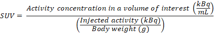 SUV is a robust quantifier that can be used to analyze PET images. In preclinical PET, SUV can be defined as a ratio of tissue radioactivity concentration (kBq/mL) and administered dose divided by animal body weight (kBq/g) [5], presented in Equation 1.