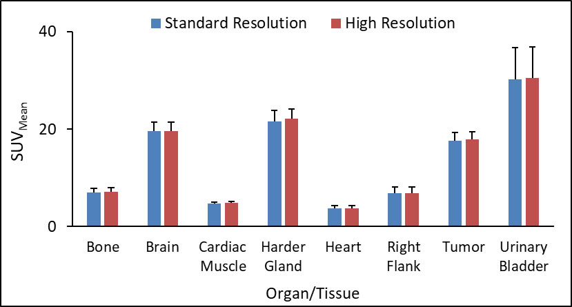 The results for target/non-target (tumor/right flank) tissue analysis are presented in Table 7. Results indicates that 18F-FDG uptake into tumoral tissue (tumor implanted in animal left flank) was approximately twice as high as uptake in healthy tissue (healthy right flank). Once more, considering the experimental setup used for image acquisitions and the reconstruction parameters used in this work the resolution mode do not affect significantly the SUV values calculated.