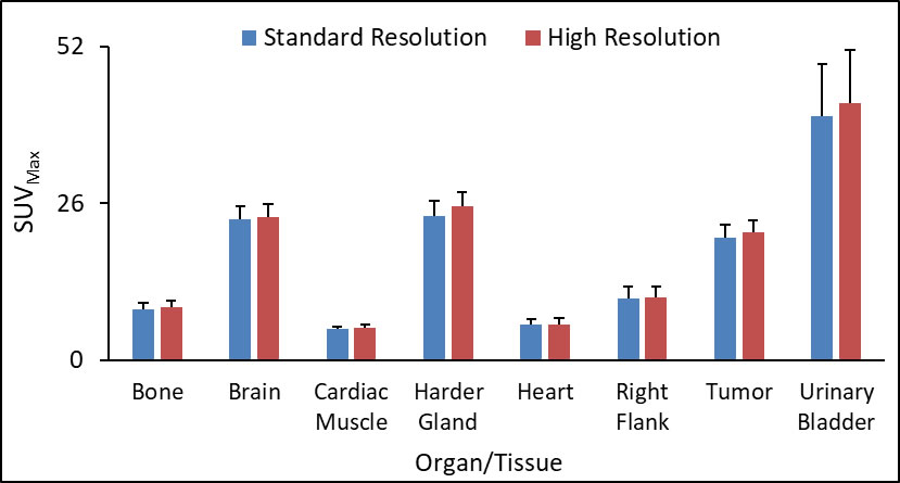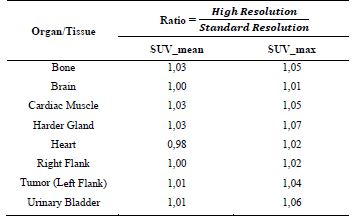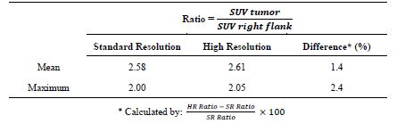 Figures 2 and 3 reveal a slight increase in SUVs for image reconstructed using high-resolution mode when compared to image reconstructed using standard resolution. Table 5 presents the ratio between high-resolution and standard resolution results for SUV_mean and SUV_max.