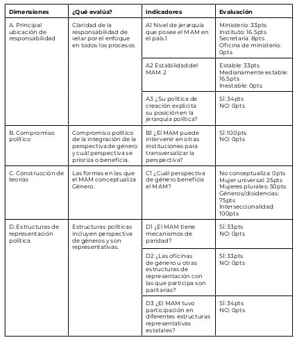 La Plataforma de Acción de Beijing consiguió el compromiso de los países firmantes para combatir los obstáculos y limitaciones existentes para el goce de la igualdad entre géneros, por medio de la creación y/o fortalecimiento de los Mecanismos para el Adelanto de las Mujeres (MAM) (Organización de las Naciones Unidas [ONU], 1995). Estos deberían ubicarse en el más alto nivel político del país, participar en la formulación de políticas y fomentar el cumplimiento de la Plataforma (ONU, 1995). La apuesta por los MAM como institución capaz de intervenir en las relaciones sociales está orientada a transversalizar la perspectiva de género en el Estado (Rodríguez Gusta, 2008). Por medio de una agenda de políticas, programas y proyectos orientados a la transformación de las desigualdades entre géneros. Con esto, se conseguiría la transformación de las relaciones desiguales entre géneros y el goce de los derechos humanos de las mujeres.