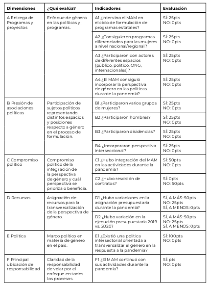 Con el fin de analizar la institucionalización del género en los Estados y la capacidad de estos para transversalizar la perspectiva de género en las políticas sociales en respuesta a la pandemia, utilizamos la propuesta teórico-metodológica de Caren Levy (1996). La autora diseñó una matriz de evaluación y análisis de la institucionalización de la perspectiva de género en el diseño, creación e implementación de políticas para el desarrollo. Esta matriz analiza trece elementos interrelacionados que pueden ser situados desde diferentes niveles y espacios de organización.