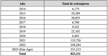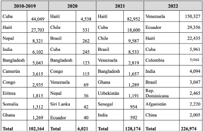La región del Tapón del Darién, que se extiende entre Panamá y Colombia, es un territorio emblemático por su singularidad geográfica; ofrece una selva densa, montañosa e inhóspita que representa un desafío para cualquier transeúnte. Esta barrera natural, prácticamente infranqueable para muchos, ha sido históricamente determinante en la construcción política, social y económica de la región. Además, su posición entre Norteamérica y Sudamérica le confiere una relevancia estratégica, que ha convertido esta selva en un corredor migratorio esencial, como puede apreciarse en el Cuadro 1, aunque también en uno de los más peligrosos y menos documentados de América Latina (Velásquez, 2015). Dentro de este vasto mosaico verde, no solo los migrantes buscan travesías hacia destinos que prometen una vida mejor o un escape de situaciones adversas. También convergen en el área actores con agendas propias, que buscan ejercer control y dominación sobre estas rutas y las personas que las transitan. Desde grupos armados hasta redes de tráfico de personas, el Darién se ha convertido en un tablero de ajedrez donde la vida humana se juega en cada movimiento (Miraglia, 2016). Adicionalmente, la región ha atraído la atención de organismos internacionales que buscan mitigar los impactos humanitarios y asegurar los derechos de los migrantes. Estas entidades, al interactuar con actores locales, tanto estatales como no estatales, añaden otra capa de complejidad al panorama ya multifacético del Darién. Su presencia y acciones pueden ejercer influencia sobre cómo se manejan los flujos migratorios, cómo se brinda ayuda y cómo se documentan las realidades en la región (Álvarez, 2023; Gissi et al., 2020).