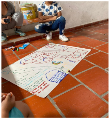 Otro elemento que surgió en el trabajo con las niñas fue el territorio que se produce al ser niña migrante. De ello dieron especialmente cuenta los variados mapas que ellas elaboraron en los que dibujaron calles, puentes, casas, escuelas, caños, cruces de calles que transitan y habitan como migrantes y niñas. Nos indicaron en los mapas lo que hacen y vivencian en dichos espacios y las problemáticas que identifican como limitantes para vivir la vida que quieren. De forma recurrente nombraron como punto de referencia lo que llamaron “su casa en su barrio, o en la zona, o en el sector tal…”. La casa como el sitio de cuidado, generalmente en alquiler “para migrantes”, donde en ese momento residían.