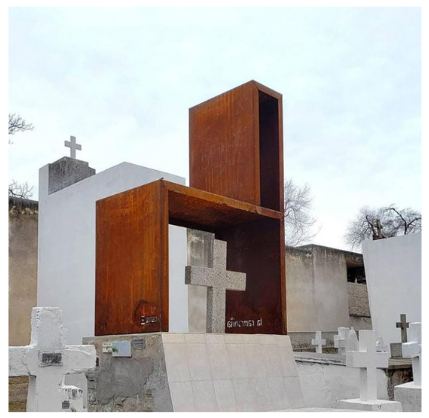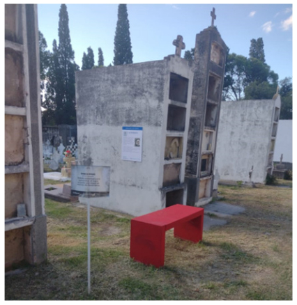 Sin embargo, cabe aclarar que pareciera haber en esta irrupción estatal sobre la tumba de la Ramonita, una actualización respecto de la forma en la que se ha tratado su muerte. Junto a su tumba también se ha colocado un banco rojo (ver Figura 4), que simboliza y sensibiliza contra la violencia de género y el femicidio, y también una leyenda que versa que la Ramonita fue “la primera víctima de femicidio del siglo XX” y confirma que “hoy los vecinos le rinden culto periódicamente”.