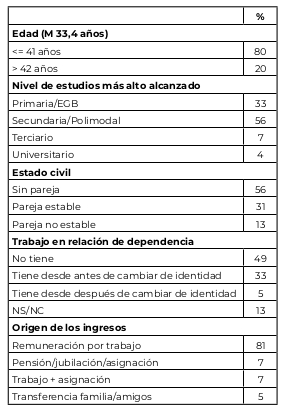 Es posible hacer una radiografía de algunas características generales de quienes se dedican al trabajo sexual. El 10% de quienes realizan trabajo sexual están casados/as, el 38% indicó tener pareja, repartido en partes iguales entre quienes tienen pareja estable y quienes indican que esta relación no es estable. El 86% de quienes realizan trabajo sexual son mujeres trans, el 9% son transexuales femeninos y 5% son travestis. No presentan diferencias de edad respecto de quienes no se dedican a este tipo de trabajo, ni tampoco diferencias en relación con la edad a la que expresaron su identidad. Respecto del nivel de estudios, el 48% indicó haber alcanzado solo educación primaria/EGB, mientras que el 52% restante alcanzó la secundaria/polimodal. El 71% señaló haber terminado el nivel alcanzado; la mayor parte de quienes no pudieron terminarlo, abandonaron en secundaria/polimodal. No hay casos de personas dedicadas al trabajo sexual que tengan estudios terciarios o universitarios, sean completos o no. El 43% indicó haber realizado cursos de formación profesional. Es posible analizar la relación con los estudios desde otro ángulo: mientras que el 66% de las personas que solo alcanzaron el nivel primario/EGB se dedican al trabajo sexual, un 44% de quienes alcanzaron nivel secundario/polimodal se dedican a esta ocupación.