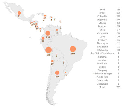 Actualmente, LA Referencia comprende 12 nodos nacionales que incluyen Argentina, Brasil, Chile, Colombia, Costa Rica, Ecuador, El Salvador, España, México, Panamá, Perú y Uruguay; con un total al momento de 3.849.372 de documentos, entre artículos, libros, capítulos de libros, reportes, tesis de doctorado y maestría, informes técnicos y conjuntos de datos.