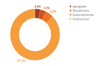 De los casi 6,000 repositorios registrados en OpenDOAR,1 765 corresponden a países de la región latinoamericana (Figura 2), de los cuales, el 87,4% se clasifican en el tipo Institucional (Figura 3).