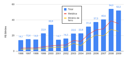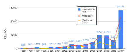 Ainda de acordo com o Gráfico 1, podemos observar que, em grande medida, esses investimentos foram direcionados à mineração metálica e, em particular, aos projetos relacionados ao minério de ferro. Entre 2001 e 2009, em relação à taxa média total de investimentos, a mineração metálica representou 83,7% do seu valor, enquanto o minério de ferro foi destino de 38,2%, entre 1996 e 2009.
