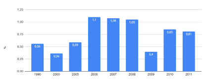 Entusiasmados com o momento em que o mercado mundial de minerais vivenciava nesse período, o Sumário Mineral (2006, p. 12), organizado pelo Departamento Nacional de Produção Mineral (DNPM), apresentava os números relativos à Economia Mineral Brasileira sob o título “Brasil Mineral: a Economia que Brilha”. Não obstante, se analisarmos a participação do PIB da mineração (excluídos petróleo e gás) na economia nacional, veremos que seus números são relativamente baixos. Conforme apresentado no Gráfico 3, entre 1990 e 2011, este índice esteve acima de 1% somente nos anos de 2006, 2007 e 2008.