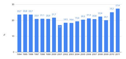 Tendo em vista esses números, o grande impacto positivo da mineração na economia do país aparenta estar restrito à contribuição para a garantia de uma balança comercial superavitária. Conforme podemos visualizar no Gráfico 4 abaixo, o setor mineral brasileiro foi responsável por cerca de 22% das exportações brasileiras, entre 1996 e 2011. Não obstante, ao longo desse período, o minério de ferro foi responsável por uma média anual de 58% das exportações do setor mineral, refletindo a dependência da exploração de um único mineral.