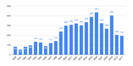 Apesar da questionável contribuição que o setor mineral brasileiro gera à economia nacional, conforme podemos comprovar a partir dos números discutidos linhas acima, o contexto político e comercial favorável fez com que o número de concessões de lavra mineira9 aumentasse de maneira significativa ao longo do período analisado. Desde os anos finais da década de 1990, o número de concessões anuais começou a aumentar significativamente. Iniciado o novo século, a média anual de novas concessões foi de 315, sendo que o ano 2006 representou o auge desse processo, quando foram concedidas 437 novas lavras.