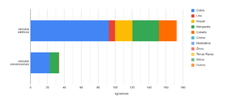 Conforme observamos no Gráfico 8 abaixo, a quantidade de minerais, em kg, necessários para a produção de veículos elétricos é cerca de cinco vezes mais do que o necessário para produzir os veículos convencionais: 70 kg de cobre a mais; 7,5 kg de lítio; 20,5 kg de níquel; 20 kg de manganês; 20,5 kg de cobalto; 0,53 kg de terras raras.