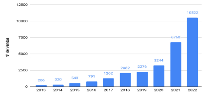 Aliás, a crescente participação dos veículos elétricos tem sido uma tendência no mercado internacional. De acordo com informe da EV-Volumes12, entre 2013 e 2022, a participação dos carros movidos a baterias elétricas ou híbridas elétricas no comércio mundial de veículos leves saltou de 0,2% para 13%, totalizando 10,5 milhões das 81 milhões de unidades vendidas em 2022. Nos últimos anos, esse aumento tem se dado de maneira mais intensa, conforme apresentado no gráfico abaixo, ao mesmo tempo em que as vendas totais de veículos leves têm sofrido constantes quedas, sendo, por exemplo, 15% menor em 2022 em comparação com 2020. Não obstante, esse comércio está concentrado em algumas regiões do mundo. Em 2022, o mercado chinês representou 58,7% das vendas globais de veículos elétricos e híbridos, seguido pela Europa (25,4%) e América do Norte (10,5%). O comércio realizado para além desses mercados representou apenas 5,2% das vendas totais.