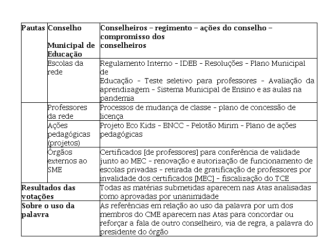 O quadro a seguir é uma demonstração dos dados oriundos de nove atas analisadas, cujas pautas foram decididas em reuniões ordinárias ocorridas entre os anos 2013 e 2022: referentes ao Conselho Municipal de educação; às escolas da rede pública municipal; aos professores da rede pública municipal; às ações pedagógicas das escolas da rede pública municipal: a órgãos externos ao Sistema Municipal de Ensino Público. Em primeira mão podemos dizer que as atas denotam um comportamento similar entre os conselheiros quanto à qualidade política da participação. Tal similaridade comportamental, tende a exprimir certo ajustamento dos membros às normas do sistema e às opções político-institucionais do poder executivo municipal.