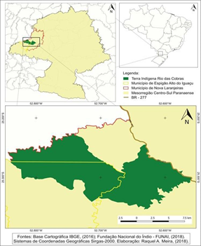A maior parte dos estudantes indígenas do curso são oriundos da Terra Indígena (T.I.) Rio das Cobras (Figura 01). Essa T.I. possui 7 aldeias: 2 Guarani Mbya (Lebre – Tapixi e Pinhal) e 5 Kaingang (Sede, Campo do Dia, Taquara, Boa Vista e Trevo). Considerando-se as matrículas ativas no semestre 2023.01, 34 estudantes residiam em Rio das Cobras, isso representava 64,15% dos estudantes indígenas do curso.
