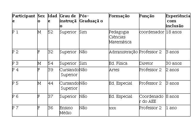 O processo de realização das entrevistas ocorreu em salas de aulas diversificadas, conforme o ambiente de trabalho dos sujeitos pesquisados. Os participantes P1 e P3 foram entrevistados na sala da direção escolar em momentos distintos, os participantes P2 e P4, em dias diferentes, foram entrevistados na sala de projetos6. O participante P5 foi entrevistado no espaço escolar, mais especificamente na biblioteca sem a presença de terceiros. O participante P6 foi entrevistado na sala de recursos multifuncionais, seu local de trabalho, já que é a coordenadora da educação inclusiva na escola. A participante P7 foi entrevistada em sua casa, em virtude de ter encerrado seu contrato antes da conclusão da coleta de dados. Esses espaços diversificados que fizeram parte das entrevistas com os participantes elencados no quadro 1 foram determinantes para conhecer os elementos norteadores que configuram o espaço escolar.