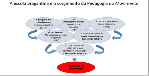 Assim, as concepções Freireanas no campo da Formação permanente de professores e o processo de construção do currículo da/na escola bragantina foram constituídos pela educação advinda do chão da escola, no exercício da análise da realidade (2013), com o diálogo sobre a interdisciplinaridade (2014) e a reflexão sobre a práxis educativa (2015), que possibilitaram construir uma Pedagogia do Movimento (2016) com cunho de educação popular na dimensão das diversidades culturais dos sujeitos, suas territorialidades, seus saberes e culturas que emergiam tanto no cerne das instituições educativas quanto nas comunidades de Bragança.