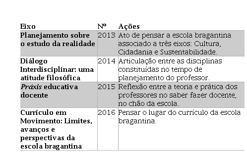 Assim, para acompanhar esse período, buscou-se analisar os eixos e as ações que se fizerem presente no projeto de formação permanente com os educadores no município de Bragança em diálogo com a cotejamento teórico relacionado ao planejamento para a construção do currículo da escola bragantina a partir da mobilização da Pedagogia do Movimento.