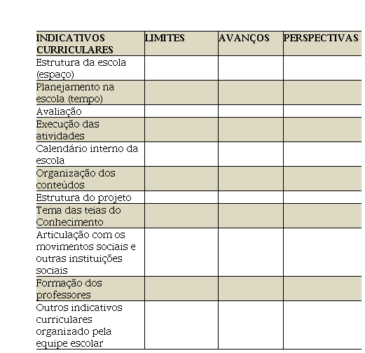 O quadro apresentado foi desenvolvido pela equipe técnica da SEMED, e contém onze indicativos curriculares, destacando os limites8, avanços e perspectivas da escola bragantina e foi entregue aos gestores e coordenadores, sendo que, posteriormente, eles iriam registar tais indicativos em reuniões com seus professores, por escola. Trata-se de um instrumento de avaliação e reflexão sobre o processo formativo e da construção curricular da escola bragantina, cujo finalidade foi identificar as fragilidades e obstáculos para redimensionar o planejamento e trazer à tona novas temáticas para o diálogo.