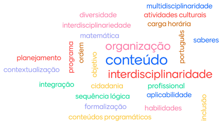 Fica evidente uma aproximação entre as respostas das duas perguntas. No caso da nuvem, a palavra central ‘conteúdo’ distingue-se como o mais básico da composição curricular, mas se pode associar à organização, ao objetivo, ao planejamento, ao programa, à carga horária, ao português, à matemática, à ordem, à sequência lógica e aos conteúdos programáticos para compor, de forma bastante tradicional, uma concepção de currículo. Outros verbetes podem assinalar ideias mais amplas, dentre elas: contextualização, inclusão, cidadania, integração, interdisciplinaridade, multidisciplinaridade, aplicabilidade, habilidades e saberes.
