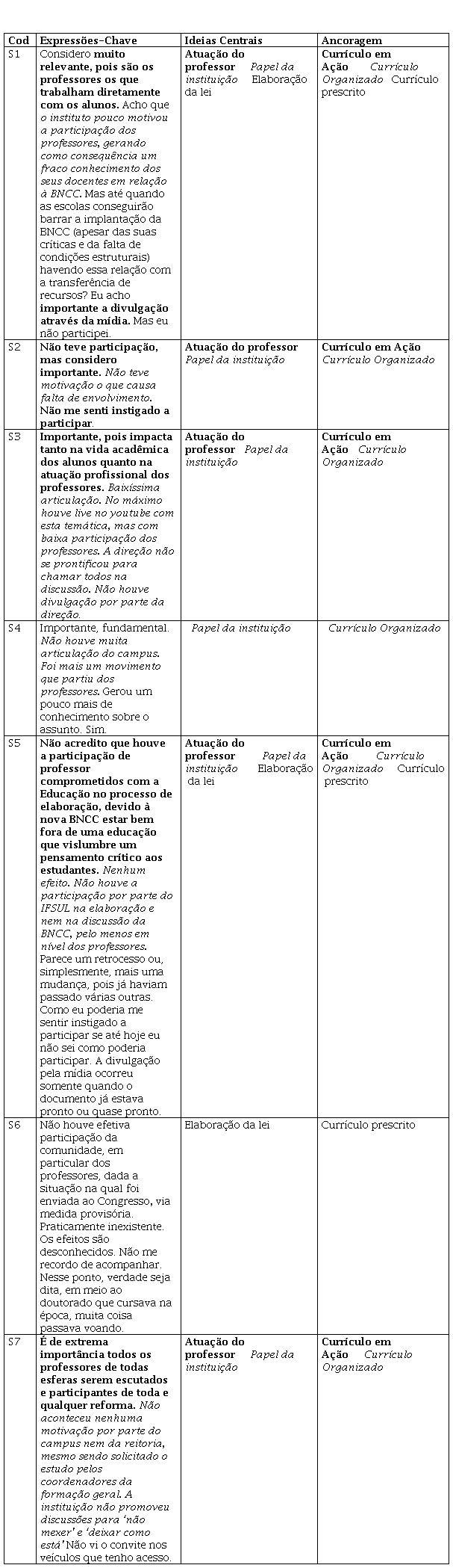 A seguir será incluído um fragmento do Instrumento de Análise de Discurso (IAD) intitulado Participação dos professores na elaboração da BNCC, que irá encadear as falas dos sujeitos da pesquisa. Trata-se de uma aplicação da técnica do DSC aos resultados obtidos na produção das informações. No quadro 1, na primeira coluna, serão representados os sujeitos que responderam ao questionário, por meio dos códigos S1, S2… e S7; na segunda coluna, são incluídas as falas dos professores, sendo destacado com o mesmo grifo (negrito, itálico e sublinhado) as partes da resposta que possuem aproximações. Para cada um desses excertos são atribuídas ideias centrais (na coluna seguinte) que sintetizam as expressões. Para as ECH que se aproximam são imputadas as mesmas IC. Na última coluna são colocadas as ancoragens. Essas são geradas rememorando o referencial teórico.