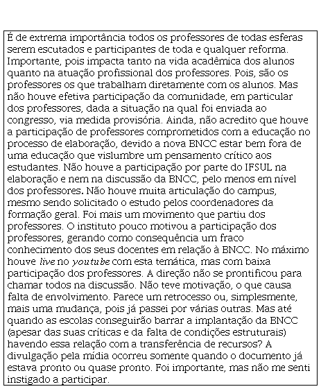 2 – No caso da Base Nacional Comum Curricular (BNCC), como você observou a articulação do Instituto Federal Sul-Rio-Grandense – Campus Pelotas na motivação para a participação efetiva dos seus professores em sua elaboração? Que efeitos geraram?