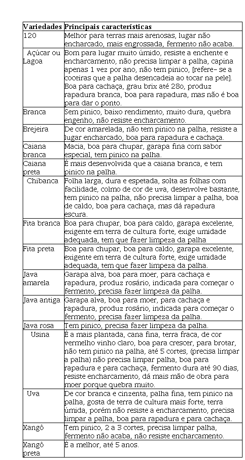 A plantação da cana de açúcar é mais propicia em ambientes com mais umidade, para que um melhor desenvolvimento e, consequentemente, um aproveitamento mais amplo em quantidade e produtividade. Normalmente, a cana de açúcar é plantada no início do ano, nos meses de janeiro a março, onde a planta absorve maior quantidade de água, esses períodos facilitam a germinação dos brotos e minimizam a quantidade de germinação de doenças nos brotos (SAKAI, 2017). No Quadro 1 estão presentes algumas das principais características de canas plantadas no Alto Rio Pardo, região onde fica localizada a Comunidade Moreira, conforme apontado por Monção e Dayrell (2007). Como é possível observar, todas as canas utilizadas por Martin apresentam potencial para produção de cachaça.