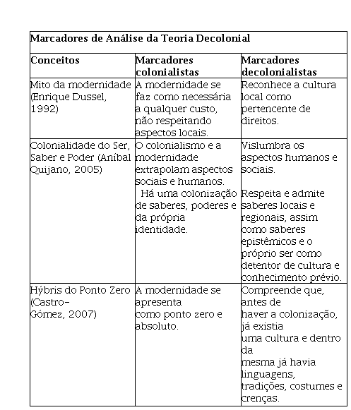 Na sequência, o marcador “Mito da Modernidade”, de Enrique Dussel (1992), que tem seus marcadores de análise se interligando de forma colonialista em cinco pesquisas. Resgatando que seu marcador colonialista reconhece que a modernidade se faz como necessária a qualquer custo, não respeitando aspectos locais.
