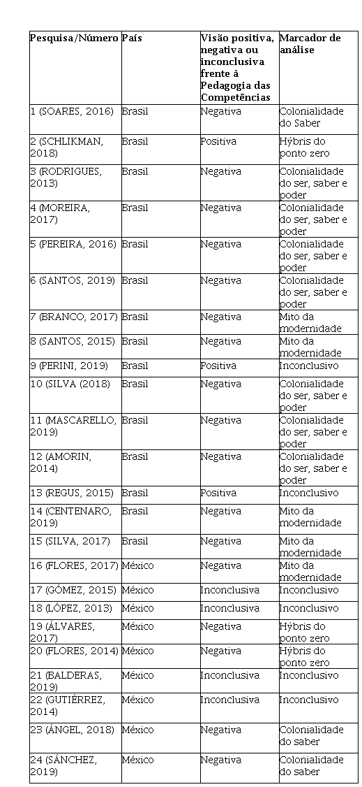 Após a apreciação das vinte e quatro pesquisas, pôde-se observar que dezessete classificaram a Pedagogia das Competências como tendo aspectos globais sobrepostos aos locais, evidenciando tendências colonialistas – 1 (SOARES, 2016), 3 (RODRIGUES, 2013), 4 (MOREIRA, 2017), 5 (PEREIRA, 2016), 6 (SANTOS, 2019), 7 (BRANCO, 2017), 8 (SANTOS, 2015), 10 (SILVA (2018), 11 (MASCARELLO, 2019), 12 (AMORIN, 2014), 14 (CENTENARO, 2019), 15 (SILVA, 2017), 16 (FLORES, 2017), 19 (ÁLVARES, 2017), 20 (FLORES, 2014), 23 (ÁNGEL, 2018) e 24 (SÁNCHEZ, 2019).