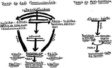 Importante salientar que na recente versão manuscrita do livro “Pedagogia do Oprimido” publicada pelo Instituto Paulo Freire (2013), o autor ousa desenhar um esquema duplo: “a “teoria da ação revolucionária” e a “teoria da ação opressora”. Este desenho à mão, provavelmente o único de sua vida, nunca foi incorporado às edições impressas. Ei-lo: