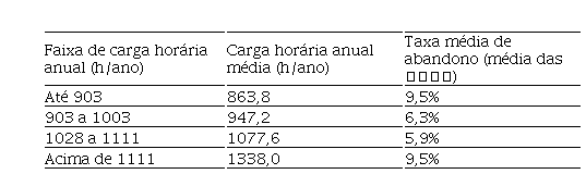 São duas as principais conclusões. Em primeiro lugar, a metodologia aplicada permitiu observar que, no que se refere ao abandono escolar, não há diferenças significativas entre cursos com três ou quatro anos de duração. Em segundo lugar, no entanto, foram identificadas maiores diferenças quando se leva em consideração as cargas horárias de oferta. Cursos com cargas horárias anuais muito distantes da média institucional (1077,6 horas/ano), para cima ou para baixo, obtiveram maiores taxas de abandono, ao passo que cursos com cargas horárias anuais próximas a esse valor correspondem a taxas de abandono menores.