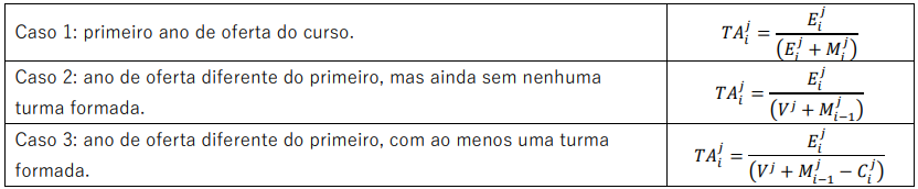 Por fim, a definição mais importante é a de taxa de abandono anual, valor calculado com base nas quantidades acima descritas. A notação para essa medida é 𝑇𝐴𝑗𝑗 e ela pode ser calculada por uma das três fórmulas apresentadas no Quadro 1, conforme o caso. A taxa de abandono é sempre dada em porcentagem.