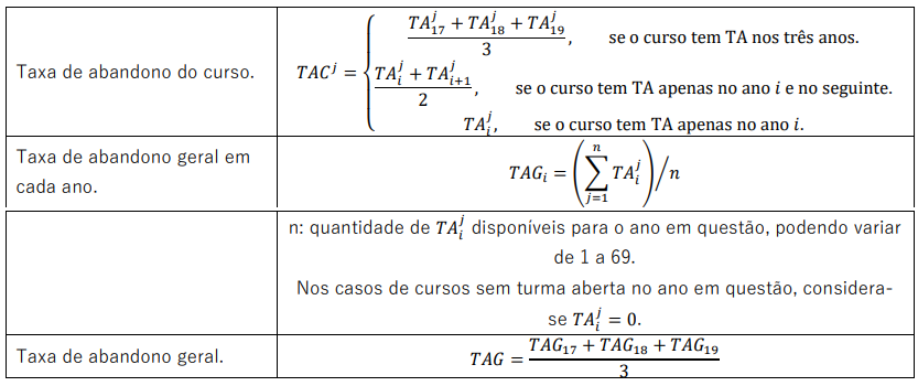 Há, finalmente, as medidas que dizem respeito ao conjunto de dados como um todo. Assim, a taxa de abandono geral em cada um dos anos foi definida, representada aqui por 𝑇𝐴𝐺𝑖 e calculada com a média aritmética das taxas de abandono anuais dos cursos. Além disso, por meio da média aritmética das três TAGs, calculou-se a taxa de abandono geral do IFPR, cuja notação é 𝑇𝐴𝐺. O Quadro 2 apresenta as fórmulas de cálculo de cada um desses últimos conceitos.