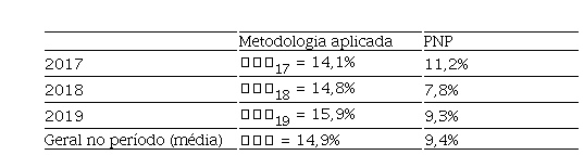 Antes da discussão dos resultados, faz-se necessário determinar um valor que possa ser considerado como referência geral do trabalho para a 𝑇𝐴. Para tanto, foi proposta a comparação entre os resultados das taxas de abandono gerais do IFPR (𝑇𝐴𝐺𝑖 e 𝑇𝐴𝐺), levando-se em conta a metodologia adotada e os valores de taxas de evasão apresentadas pela PNP. As porcentagens constam na Tabela 1.