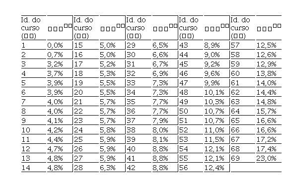 Assim, dos 69 cursos analisados, 53 (76,8%) apresentam 𝑇𝐴𝐶 inferior a 12,0% e 16 (23,2%) possuem 𝑇𝐴𝐶 maior que essa referência proposta. Cursos do eixo tecnológico de Informação e Comunicação, que totalizam um terço da oferta de EMI no IFPR (ou seja, 23 cursos), apresentam dez com 𝑇𝐴𝐶 superior a 12,0% e, dentre elas, as três mais altas de todo o universo pesquisado. Essas 𝑇𝐴𝐶𝑠 recebem os números 67, 68 e 69 (𝑗𝑗 = 67 e 𝑗𝑗 = 68 e 𝑗𝑗 = 69) na Tabela 2, que apresenta em ordem crescente todos os valores obtidos.