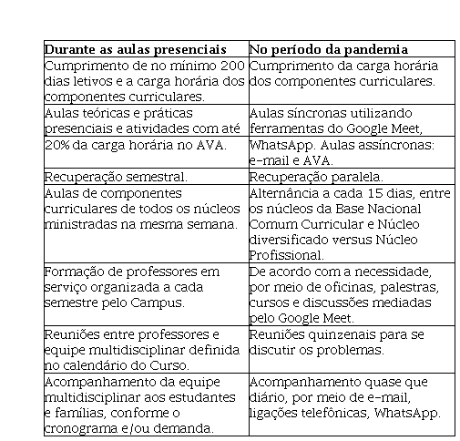Para garantir os direitos de acesso dos estudantes à educação, com o advento da pandemia de Covid-19, balizados por documentos orientadores nacionais e institucionais, em reunião de colegiado, foi deflagrada a continuidade de atividades de ensino, que teve como suporte principal o Ambiente Virtual de Aprendizagem (AVA) e os recursos de ferramentas como o Google Meet, o WhatsApp, e-mail, dentre outros, que têm como mediação o uso de tecnologias da comunicação e informação com acesso à rede mundial de computadores.