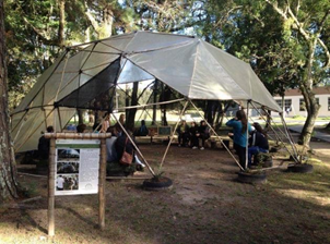 A proposta de construção da Cúpula Geodésica surgiu no contexto da disciplina denominada Fundamentos de Educação Ambiental formal e não formal, quando foi solicitada, como tarefa avaliativa, que os estudantes elaborassem projetos que articulassem os conceitos de Educação Ambiental e sustentabilidade. Dentre os trabalhos apresentados, ganhou destaque a Cúpula Geodésica, que buscava representar a ligação entre natureza, tecnologia e boas práticas de sustentabilidade, a qual pode ser observada na imagem a seguir: