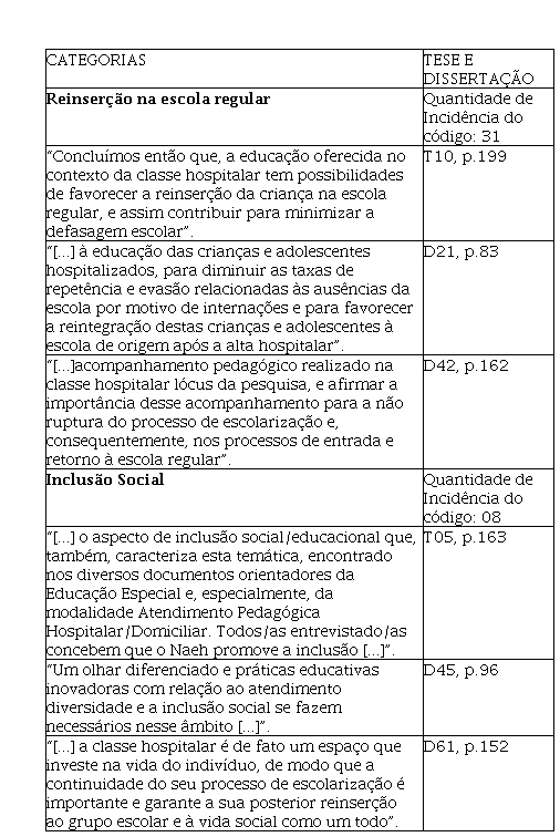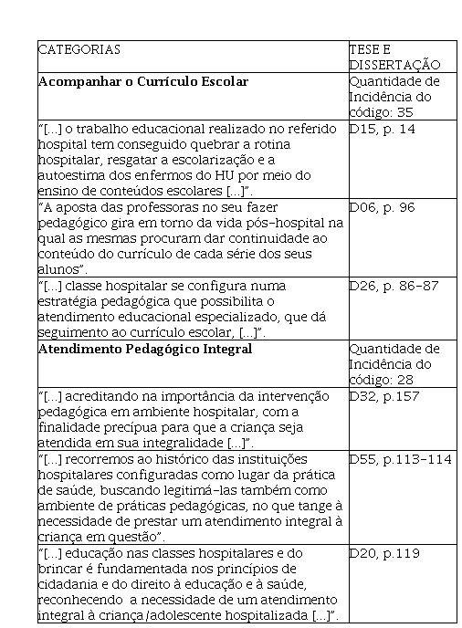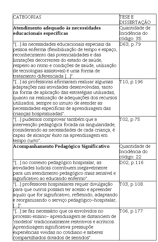 Apresenta-se a seguir uma sequência de quadros que retratam os fragmentos textuais retirados das considerações finais das pesquisas acadêmicas, com vistas a justificar cada categoria que esboça as atribuições e as contribuições da OTP no atendimento educacional hospitalar.