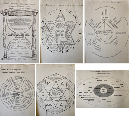 Inicialmente, a divulgação do curso incluiu o envio de uma carta-convite às equipes diretivas, esclarecendo e orientando que a inscrição estaria condicionada à escrita coletiva, por meio da qual compartilhassem sua experiência de planejamento e organização do ensino na escola. Após, a maioria enviou a escrita de uma Carta Pedagógica para a inscrição no curso, atendendo às orientações recebidas quanto a compartilhar aprendizagens e também preocupações e questionamentos oriundos da experiência da pesquisa como fonte do currículo. Com esta finalidade, deveriam anexar materiais produzidos no planejamento, tendo em vista o diálogo com os professores e a professora que ministrariam o curso. Entre outros anexos, as Cartas Pedagógicas continham a expressão gráfica do Complexo Temático que apresentava a organização do ensino em cada escola, como mostra a imagem a seguir.