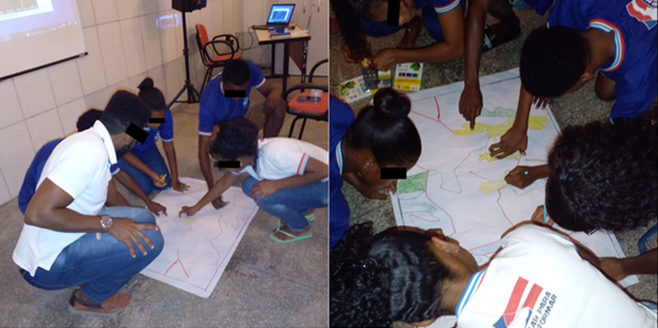 O MST também traz essa perspectiva ao afirmar que na sala de aula os estudantes não devem apenas se portar como seres passivos, receptáculos de informações trazidas pelo professor, o que configura a educação bancária discutida por Freire (2002). Ao contrário, a sala de aula se torna um ambiente em que os estudantes colocam em prática os instrumentos teóricos discutidos nas aulas para leitura de mundo, de sua realidade, de suas experiências de vida, de seu território como preconiza a educação problematizadora. A Cartografia Participativa aporta neste princípio pedagógico, como revela as imagens abaixo (Fig. 1) sobre o processo de feitura dos mapas pelos estudantes em um ambiente de dialogicidade e de construção coletiva de conhecimentos.