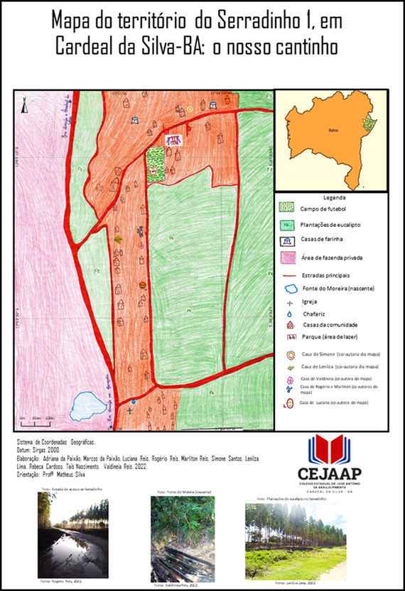 Os dados e o mapa acima refletem a contradição da realidade agrária brasileira se materializando na escala do lugar: grandes extensões de terra em mãos de poucos, favorecendo a concentração fundiária, enquanto do outro lado, muitas famílias de camponeses com pouca ou nenhuma terra e com seus territórios sob ameaça. Essa é a realidade socioespacial percebida pelos estudantes a partir do mapa feito, como se notou em algumas falas:
