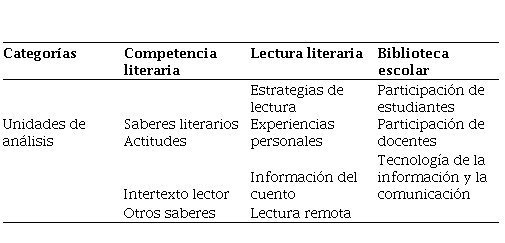 lectura literaria permite estudiar el encuentro del estudiante con el texto, por ende, sus unidades de análisis giran en torno a los aportes del lector y del texto. La categoría de biblioteca escolar cuenta con tres unidades que posibilitaron evidenciar el papel del estudiante, del docente y de las tecnologías de la información y las comunicaciones (TIC) para fortalecer la competencia literaria en tiempo de pandemia.